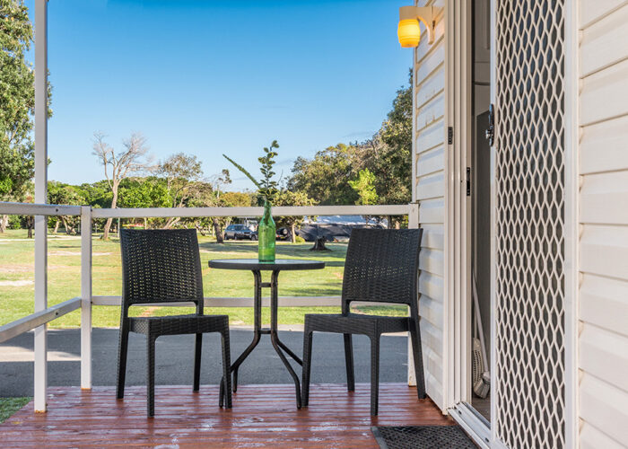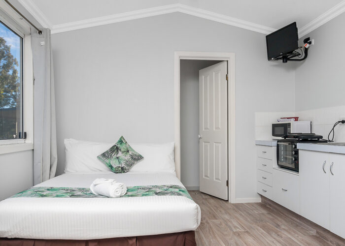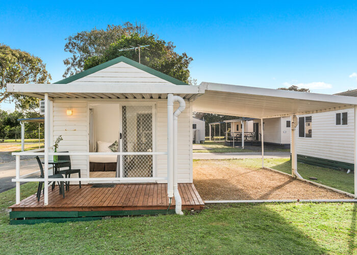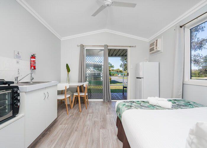 Our basic Family Cabin sleeps a family of 5 people. The main bedroom is equipped with a queen bed and and the hall alcove has a set of triple bunks. (Suitable for children only). There is also an open plan living area, kitchen, with a fridge, oven, stove top and microwave. Enjoy and soak up the sun on our north facing covered patio facing the pool and water park. The cabin also includes an ensuite bathroom. All linen provided. Pets are welcome using their own bedding, provide you follow the terms and conditions in our pet policy.