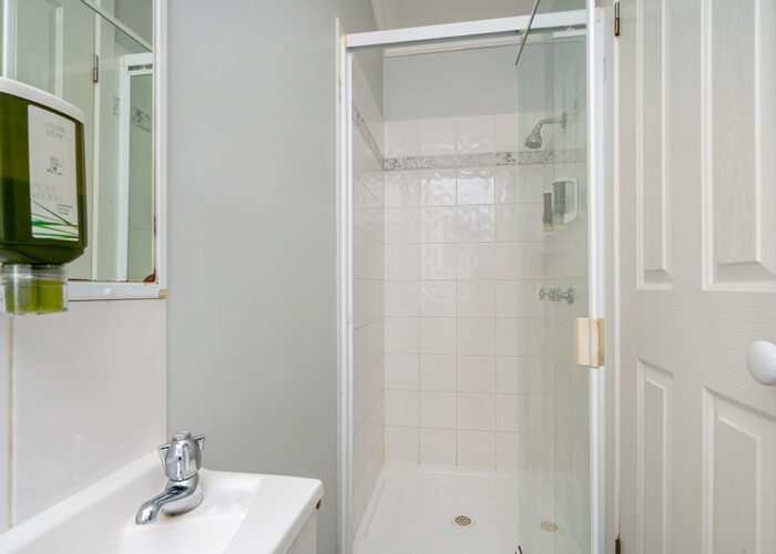 The cabin has one main bedroom with a queen bed, a second bedroom (hall alcove) with a set of bunks (suitable for children only).