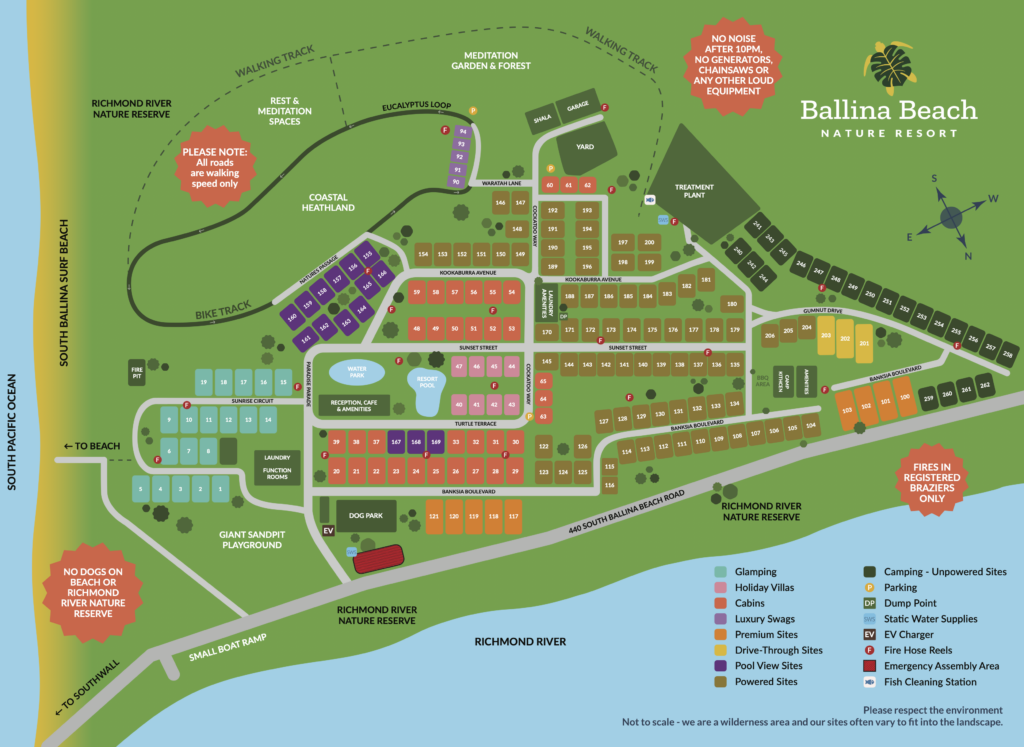 Ballina Beach Nature Resort is spread over nine hectares of stunning coastal bushland next to South Ballina Surf Beach, Richmond River’s aptly named Dolphin Bay and the Richmond River Nature Reserve.